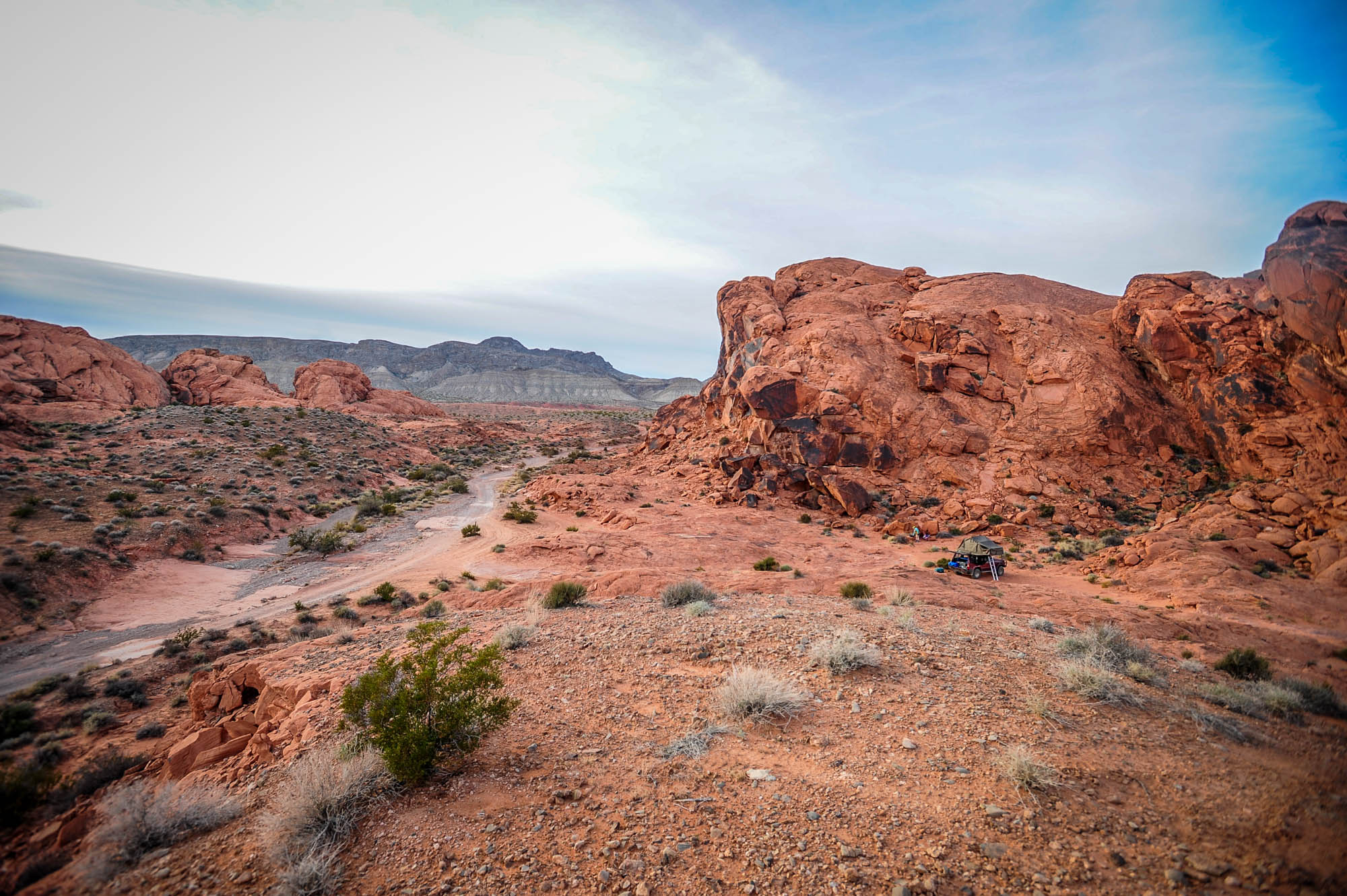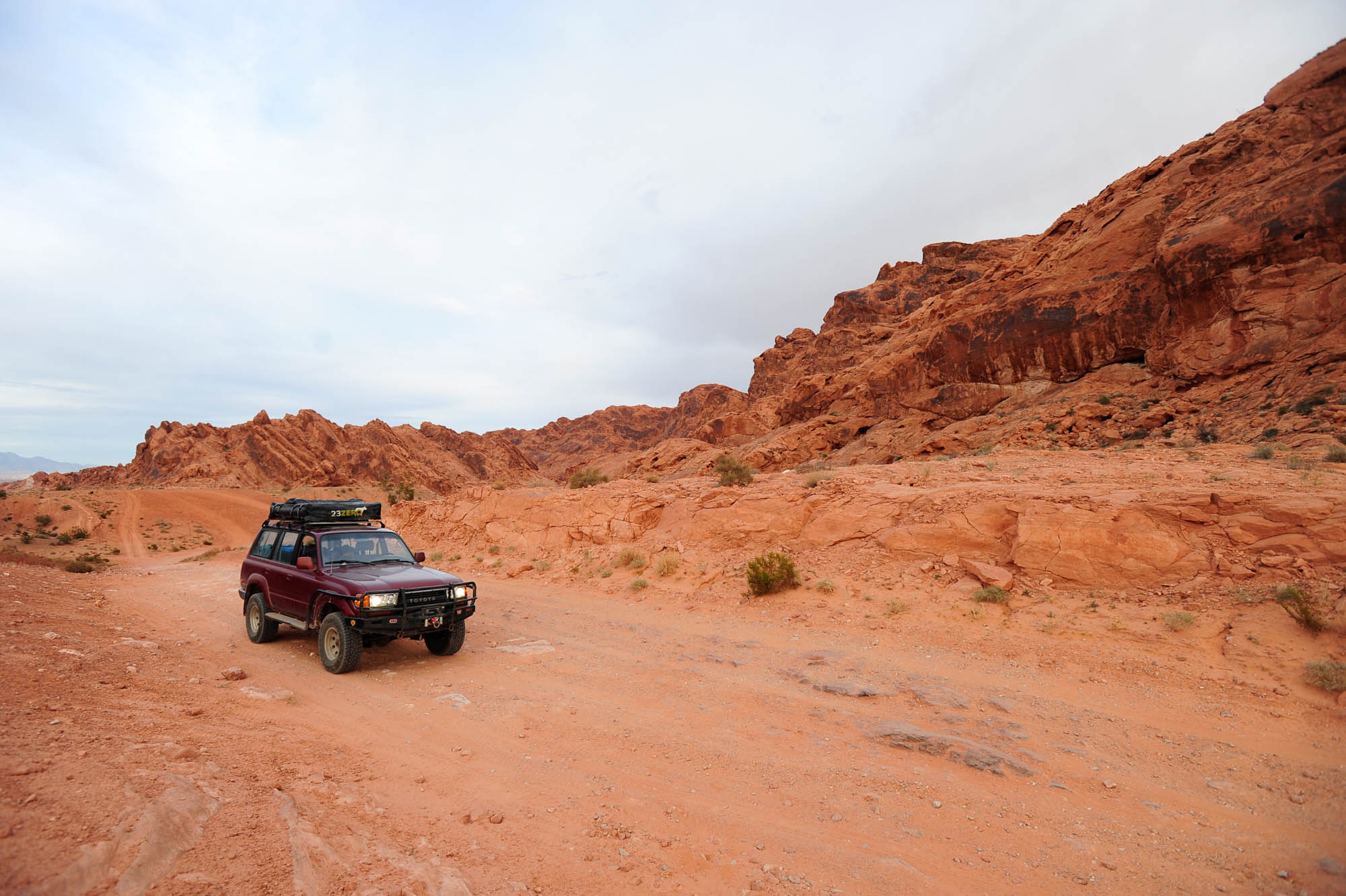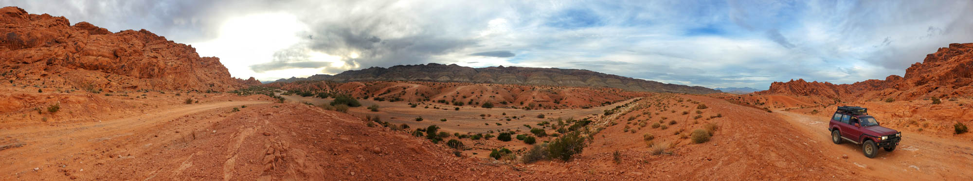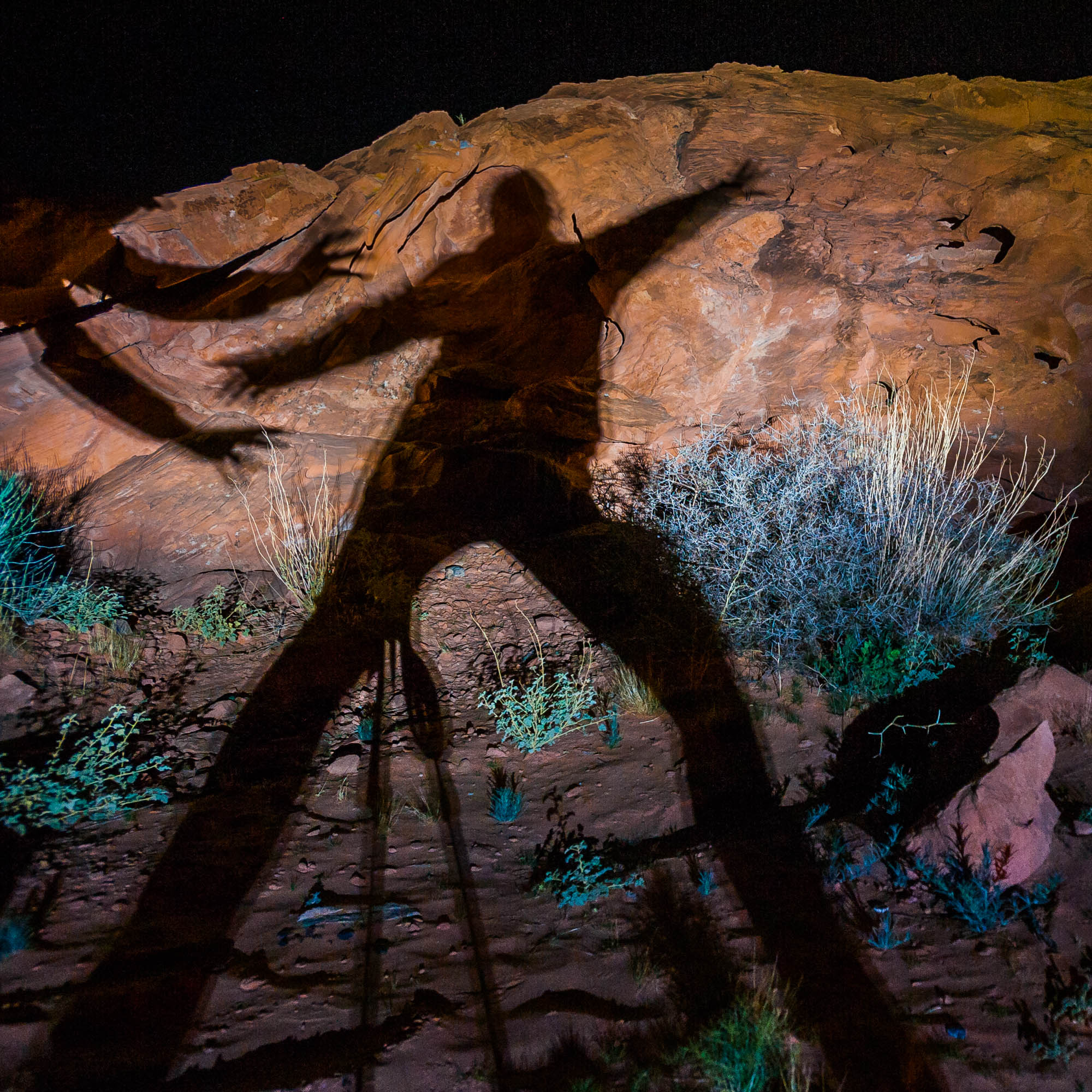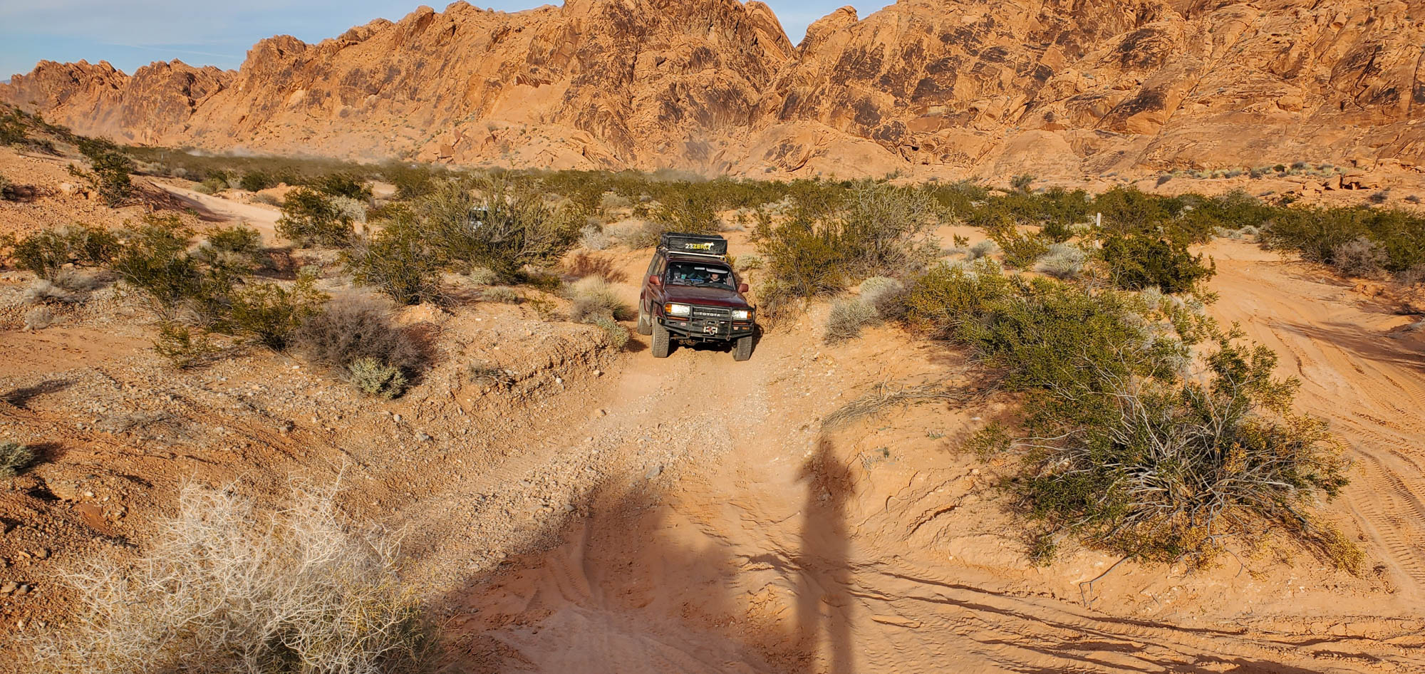 At Logandale we entered the ‘Logandale Trails’ off-road area. Intended primarily for quads and side-by sides. The roads were no problem for our Landcruiser. Again, more red-coloured rocks, although tilted. To the east, on the horizon, perfectly horizontal layers of sedimentary rocks. We passed the parking lot full of campers and RV’s, and empty trailers for off-road vehicles and had the area to ourselves. We camped here for 2 nights, and had a little fun making shadows of ourselves with the truck headlights. Photo gallery below.