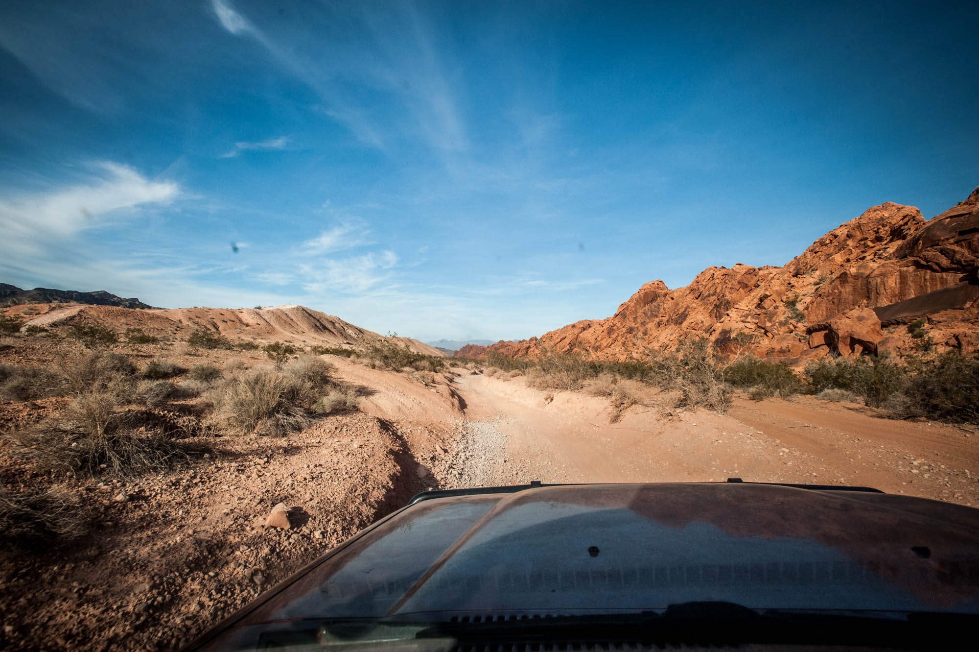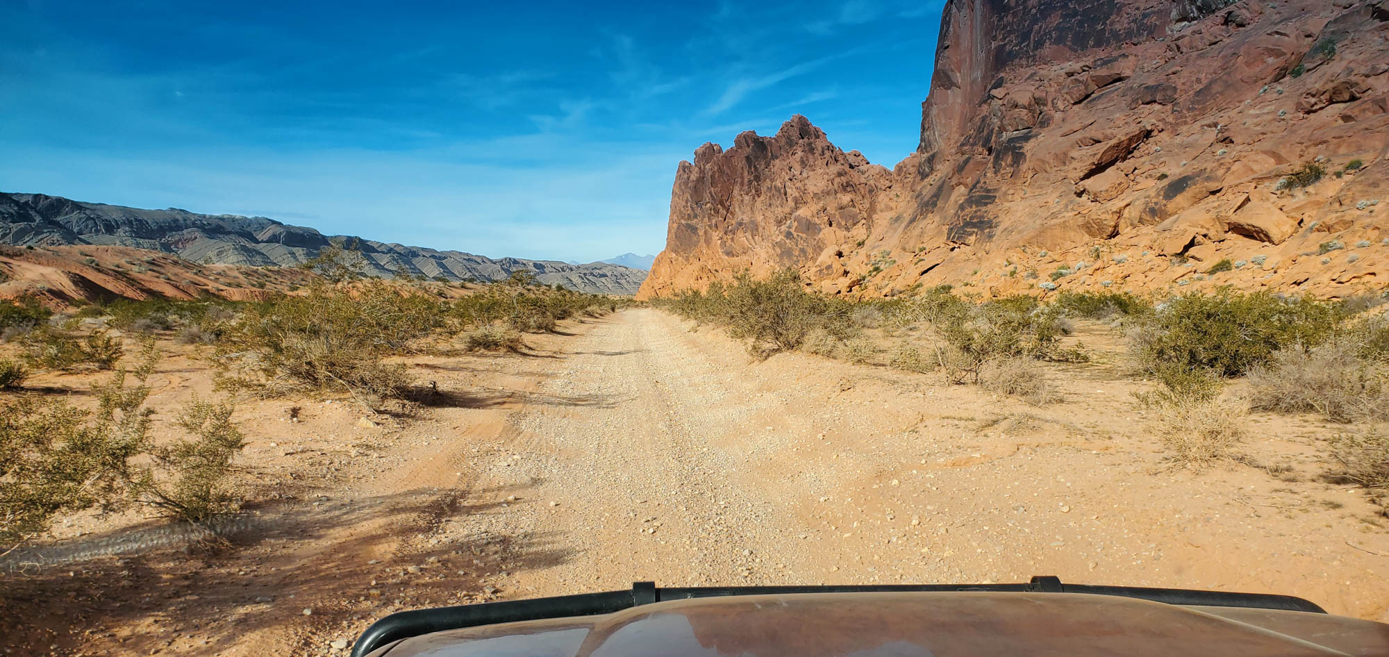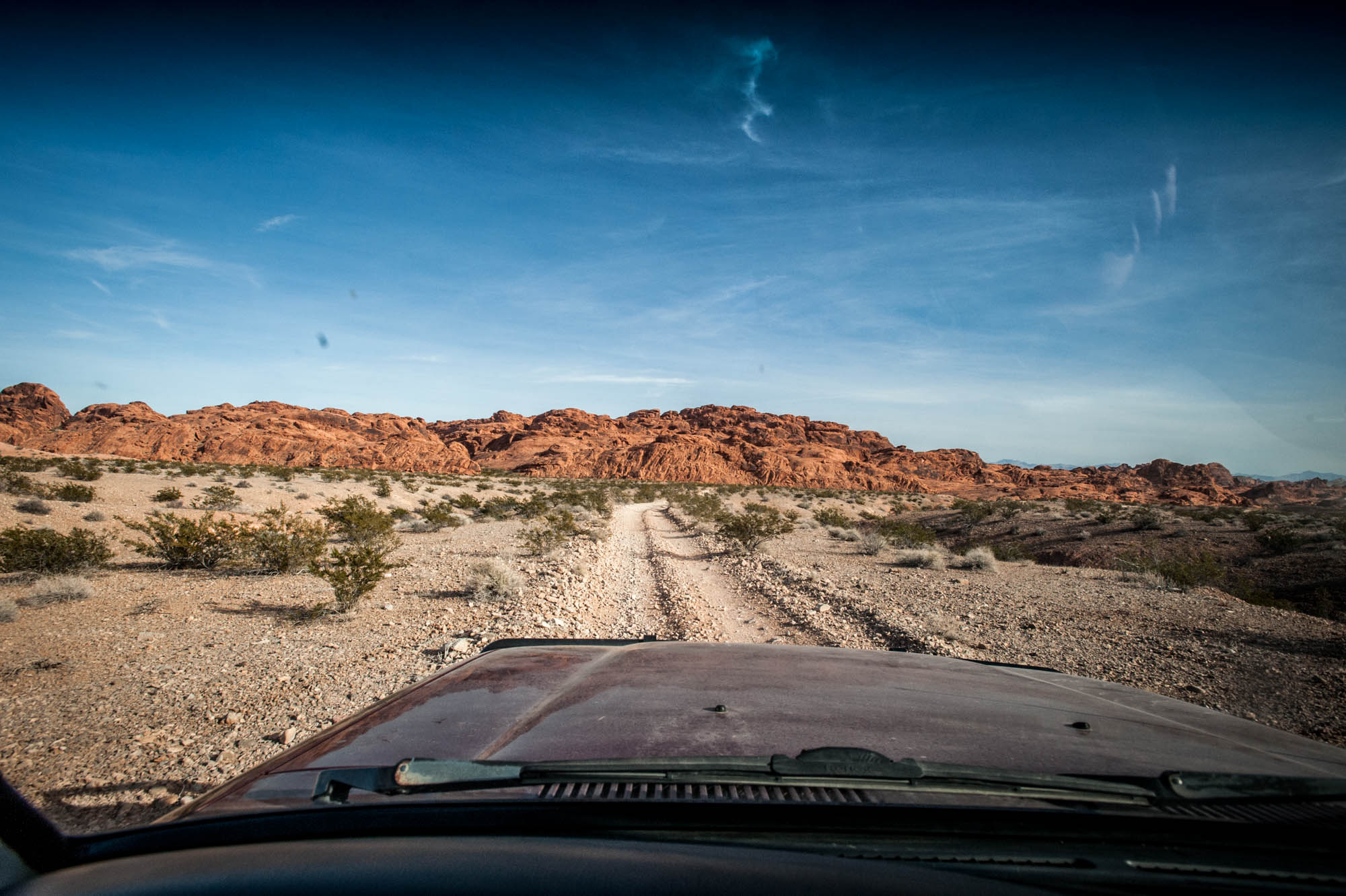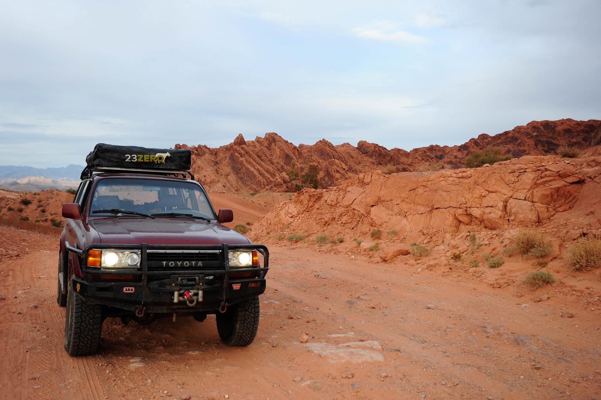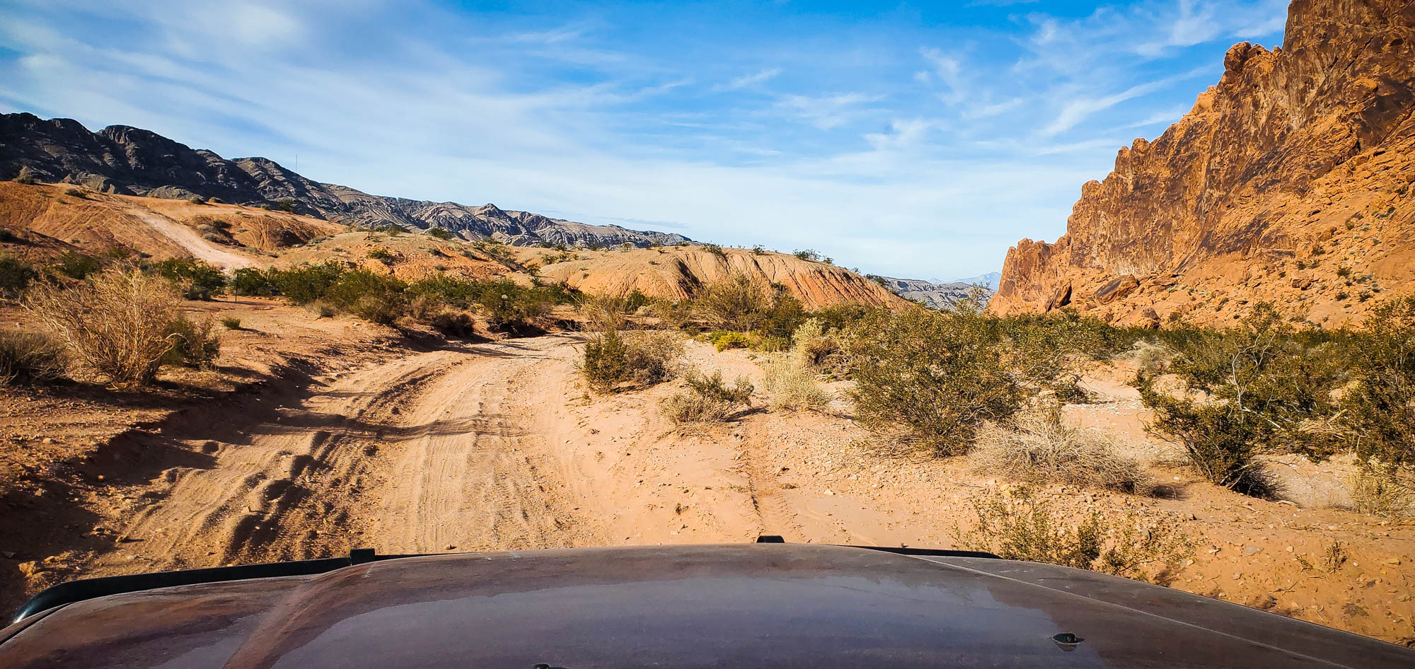 At Logandale we entered the ‘Logandale Trails’ off-road area. Intended primarily for quads and side-by sides. The roads were no problem for our Landcruiser. Again, more red-coloured rocks, although tilted. To the east, on the horizon, perfectly horizontal layers of sedimentary rocks. We passed the parking lot full of campers and RV’s, and empty trailers for off-road vehicles and had the area to ourselves. We camped here for 2 nights, and had a little fun making shadows of ourselves with the truck headlights. Photo gallery below.