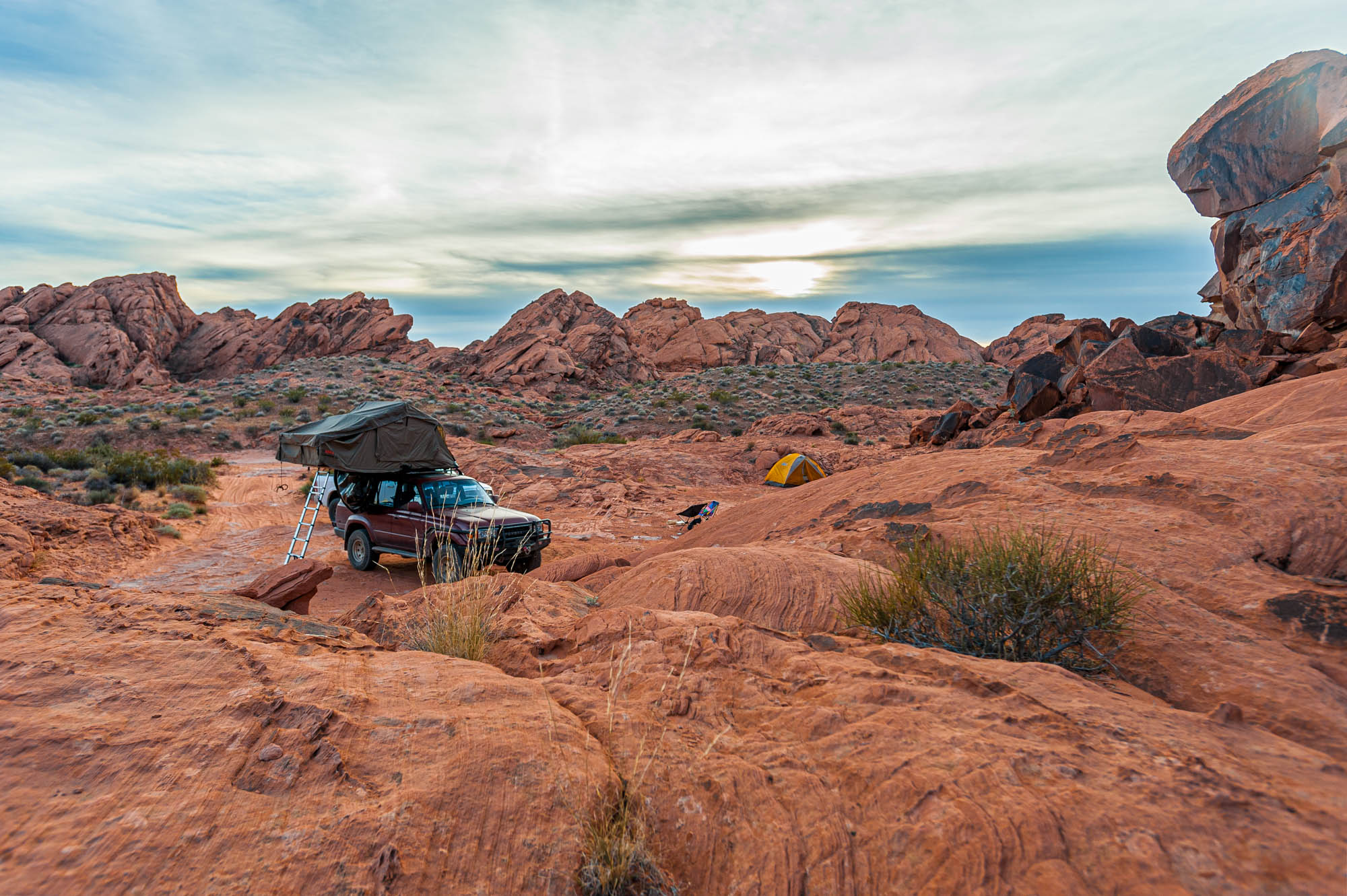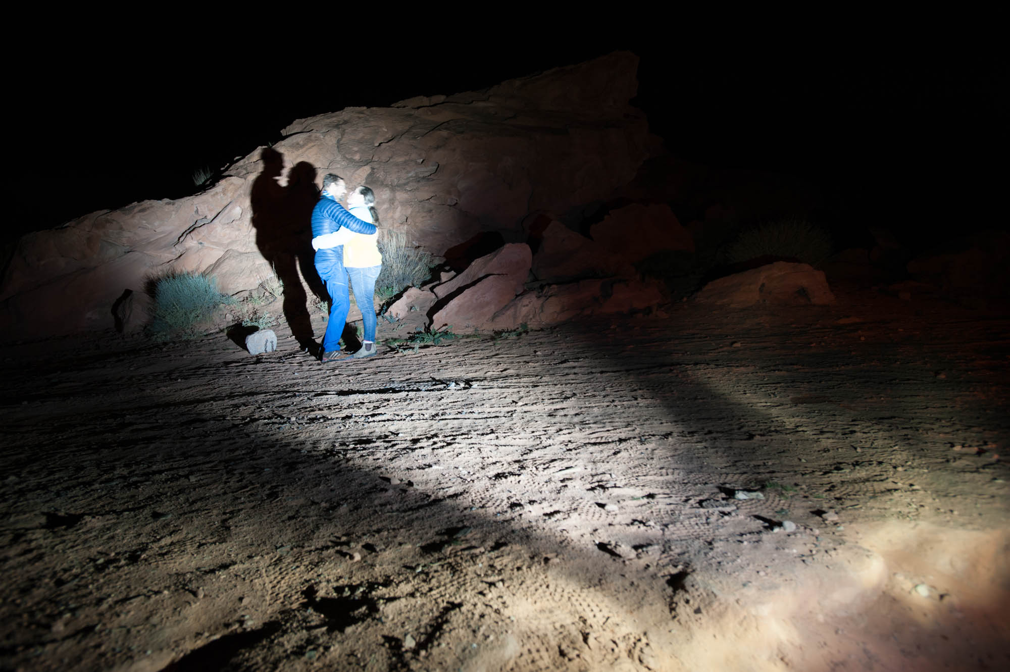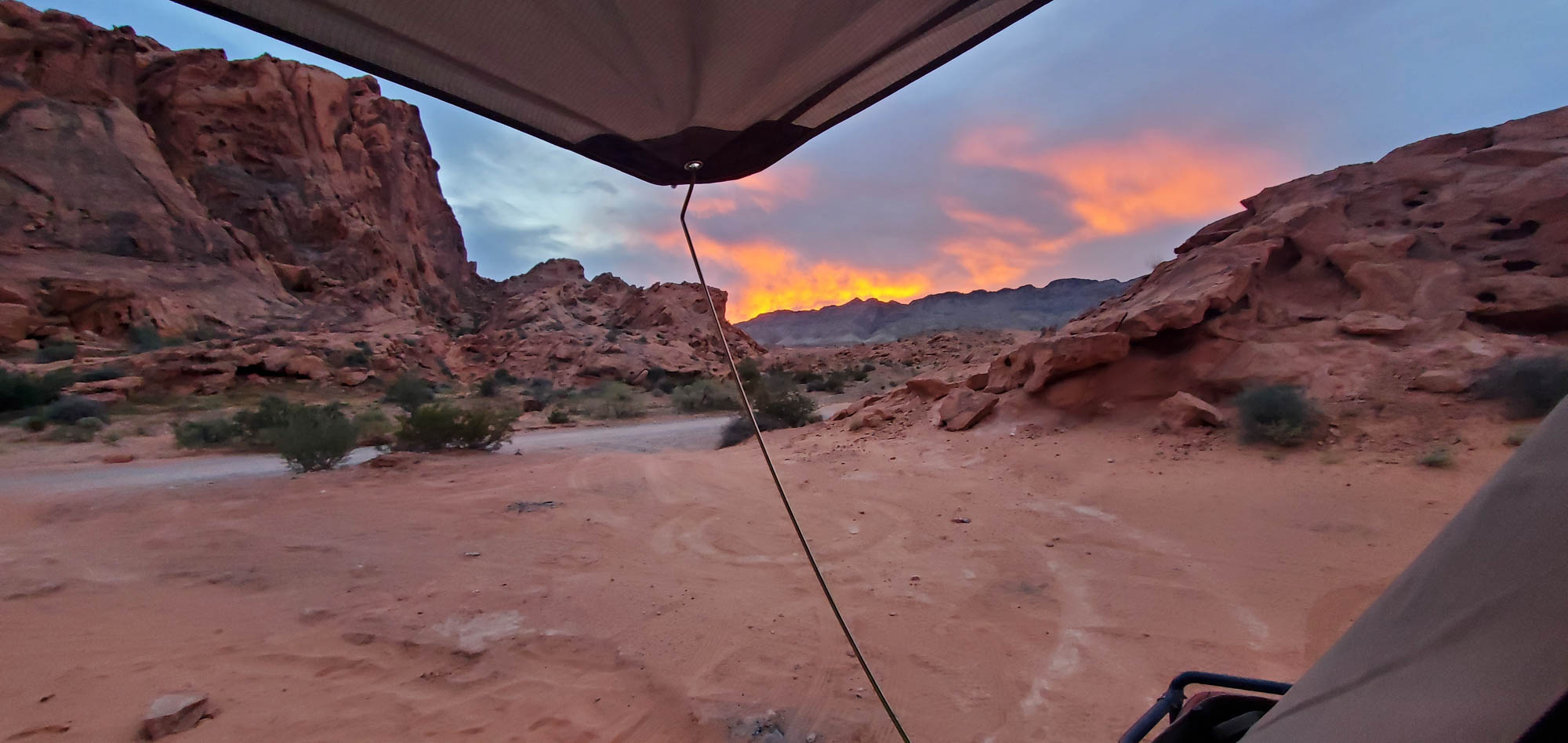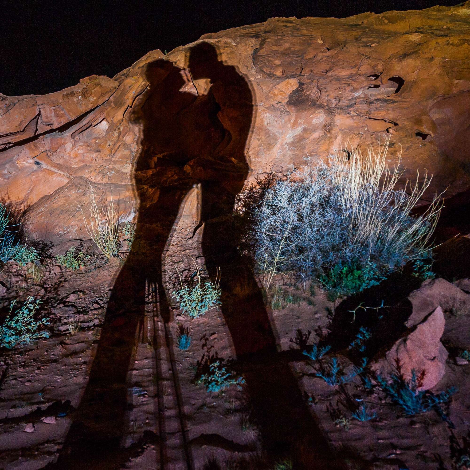 At Logandale we entered the ‘Logandale Trails’ off-road area. Intended primarily for quads and side-by sides. The roads were no problem for our Landcruiser. Again, more red-coloured rocks, although tilted. To the east, on the horizon, perfectly horizontal layers of sedimentary rocks. We passed the parking lot full of campers and RV’s, and empty trailers for off-road vehicles and had the area to ourselves. We camped here for 2 nights, and had a little fun making shadows of ourselves with the truck headlights. Photo gallery below.