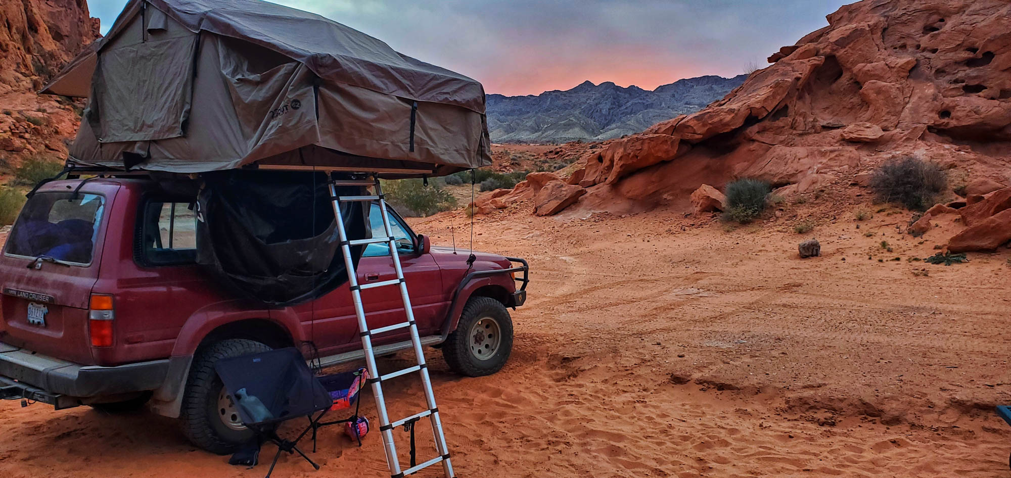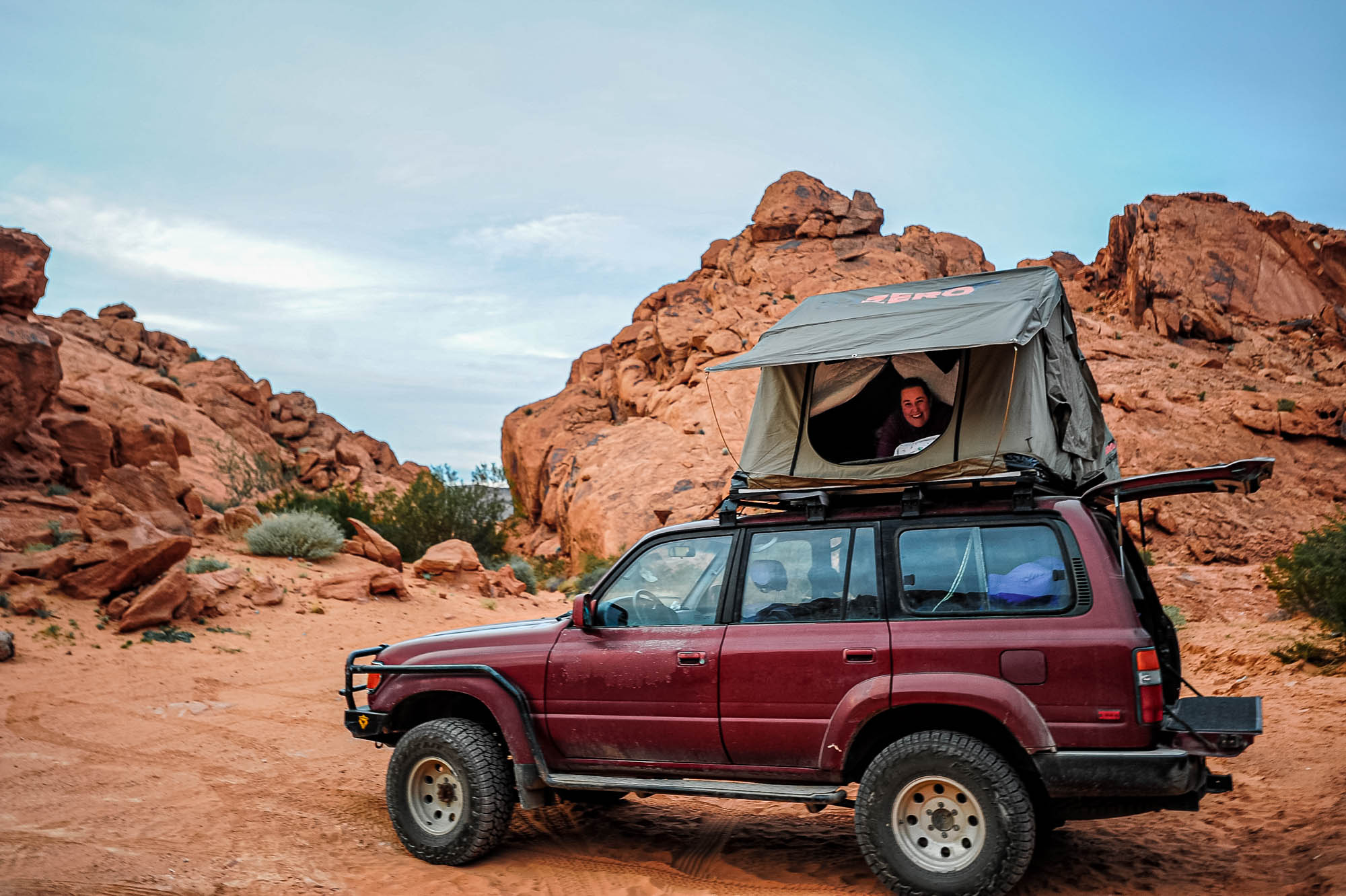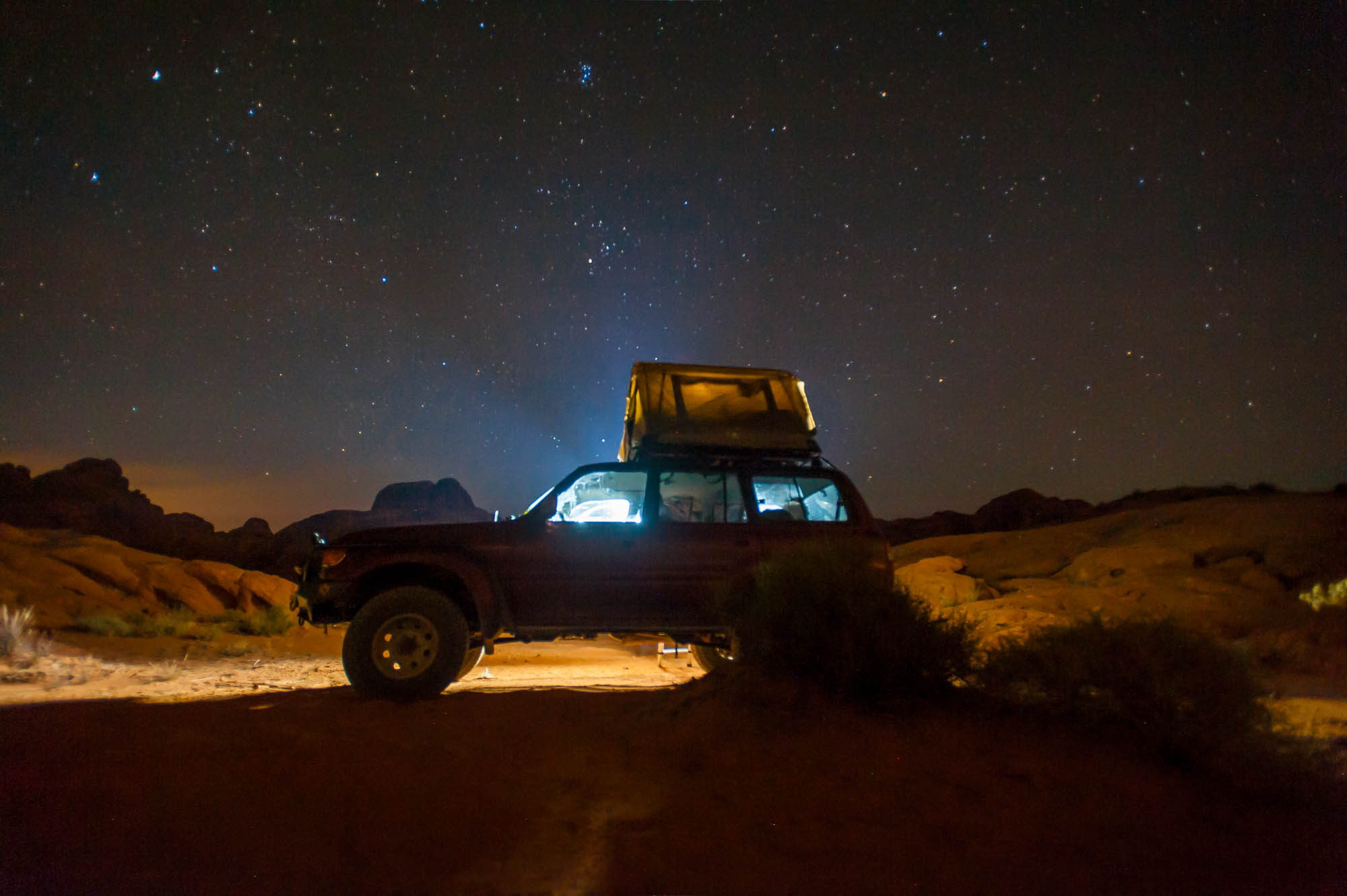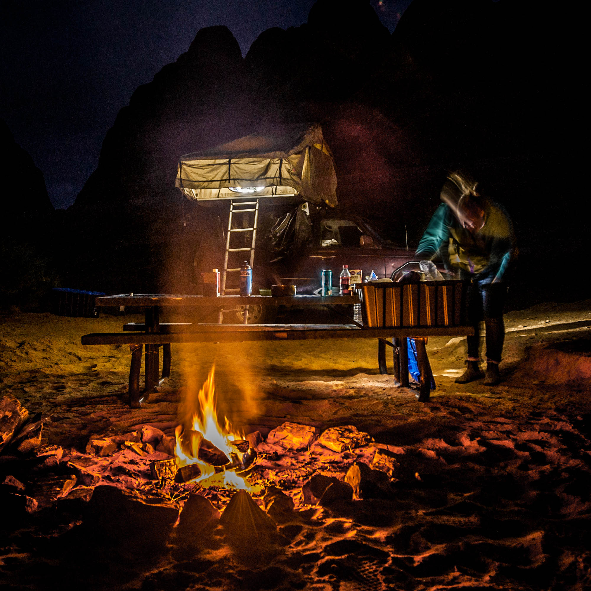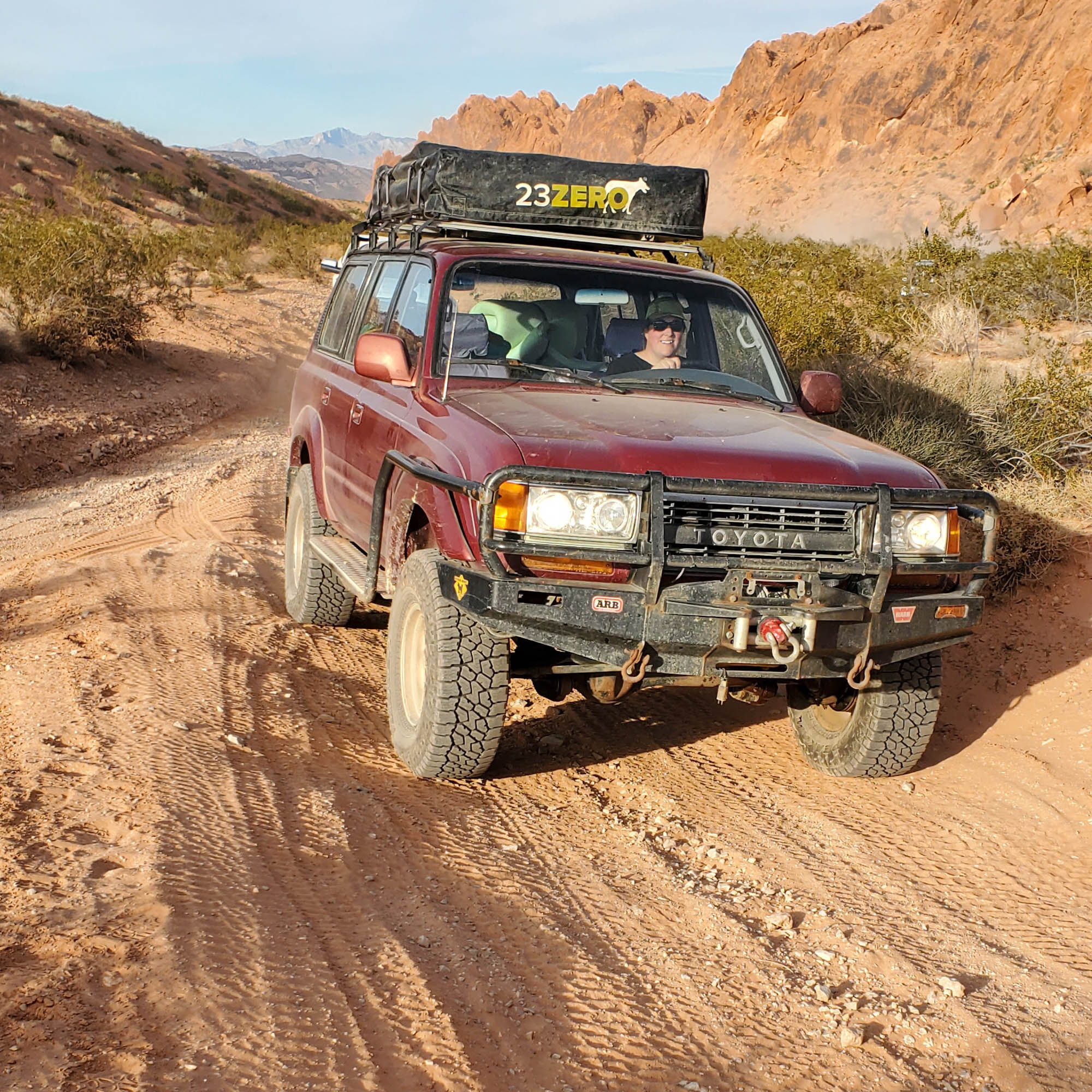 At Logandale we entered the ‘Logandale Trails’ off-road area. Intended primarily for quads and side-by sides. The roads were no problem for our Landcruiser. Again, more red-coloured rocks, although tilted. To the east, on the horizon, perfectly horizontal layers of sedimentary rocks. We passed the parking lot full of campers and RV’s, and empty trailers for off-road vehicles and had the area to ourselves. We camped here for 2 nights, and had a little fun making shadows of ourselves with the truck headlights. Photo gallery below.