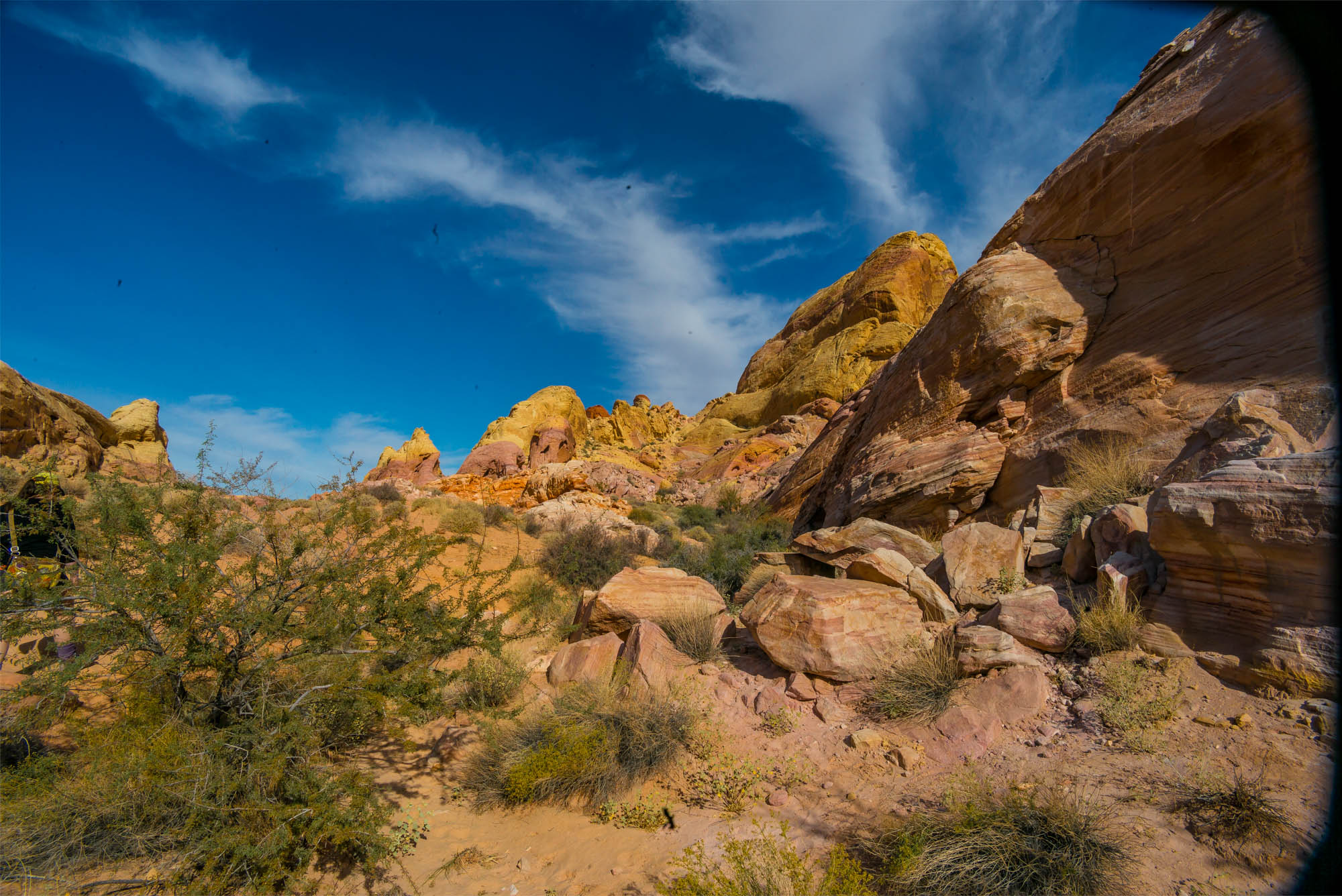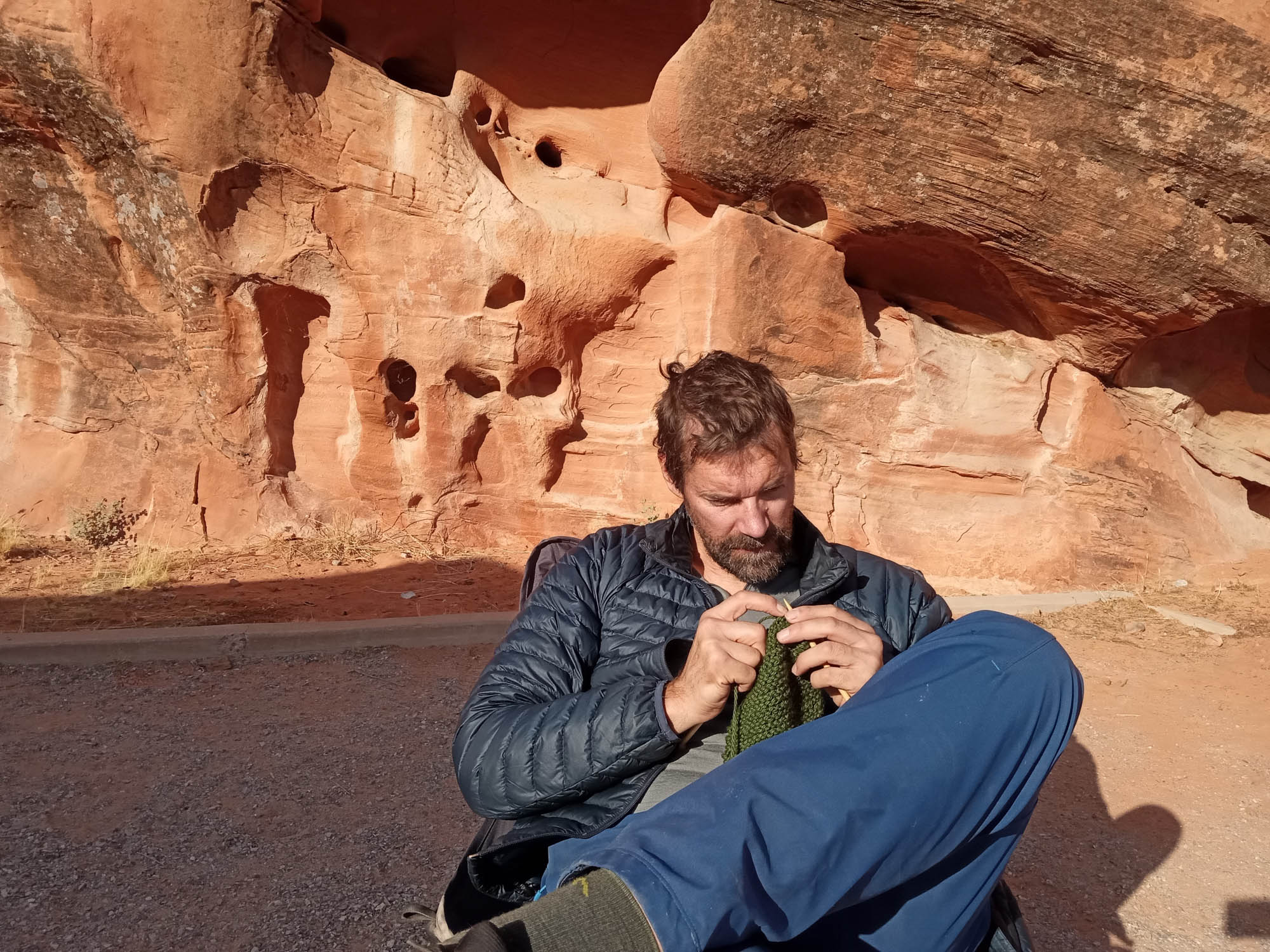 Valley of Fire is characterized by layers of bright red sandstone and grey limestone. The sandstone was deposited during the Jurassic period (201.3 million to 145 million years ago), by the wind after inland seas subsided and the land rose. Photographically the conditions were challenging – bright sun and no clouds, as such the photos appear over contrasty. we did an early morning walk – but got in trouble from the Park Ranger because we were walking on the road (not a vehicle to be seen for miles !). Yes, the rumour it true – I did knit myself a scarf !. Photo gallery below.
