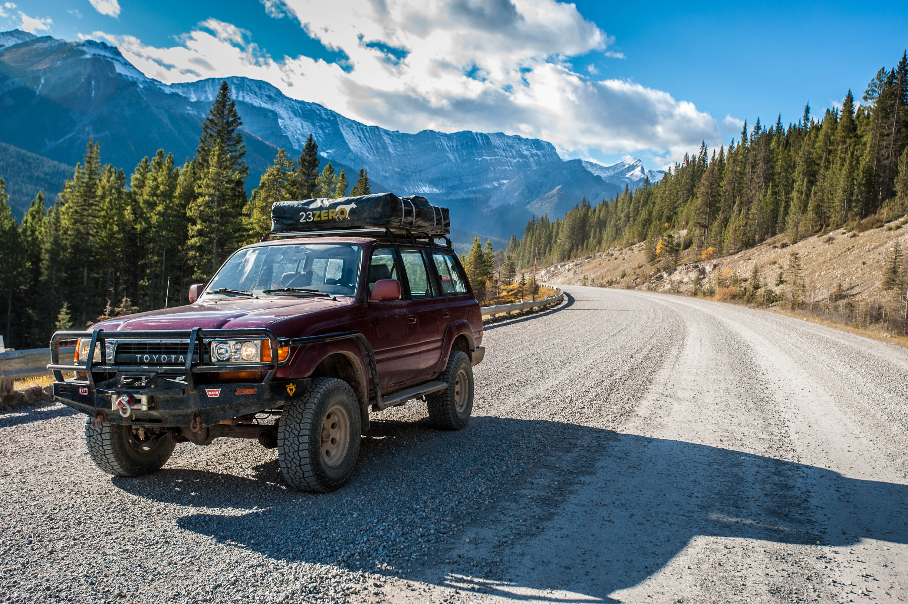 It has a ARB front bumper, Warn Zeon 12 winch, ARB airlocker on rear differential, 2.5″ Old Man Emu heavy lift, rocker guards and a 23Zero rooftop tent on a DIY roof rack with Smittybuilt + 8020 rails.