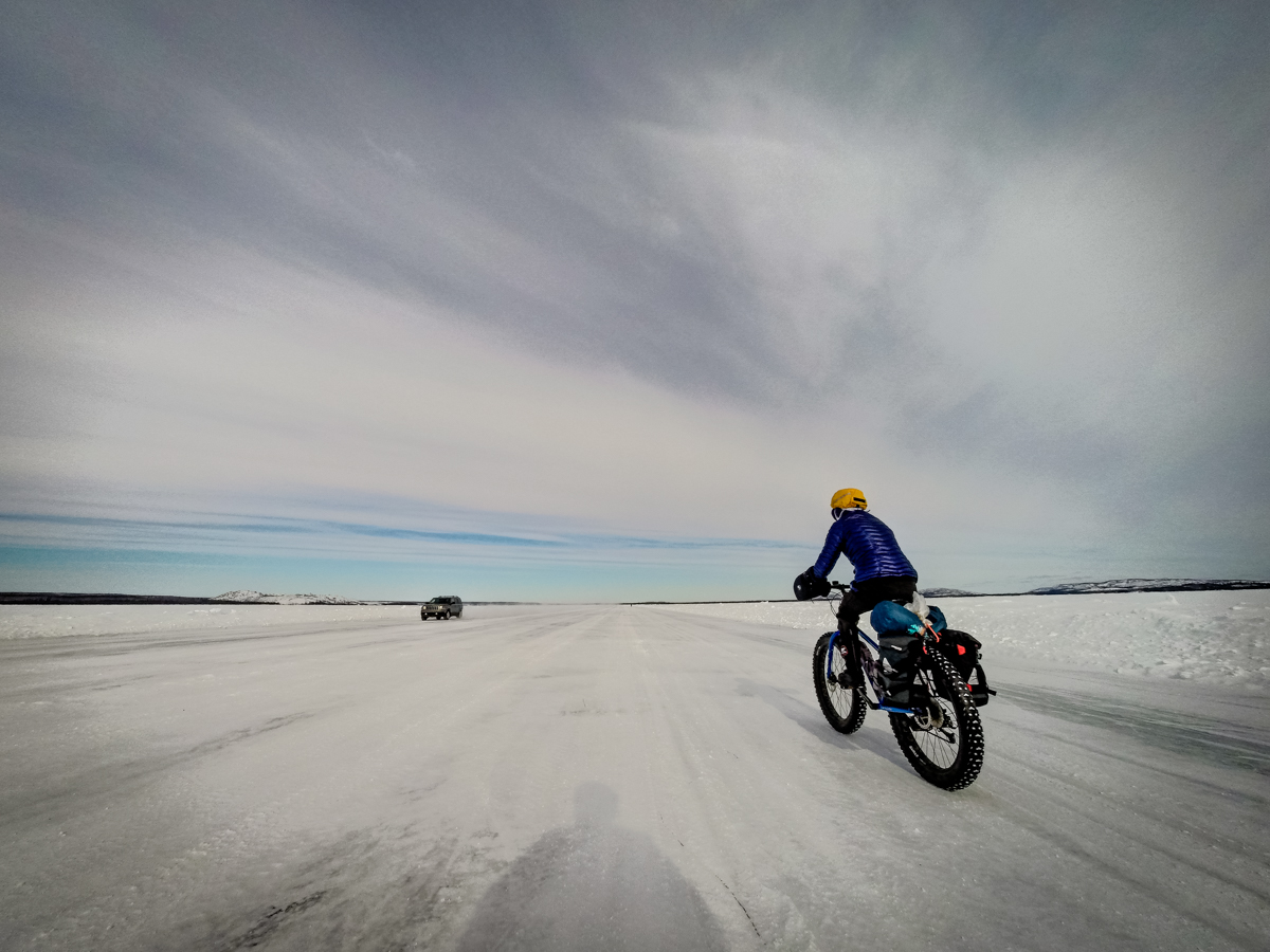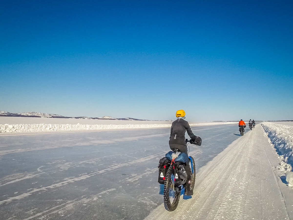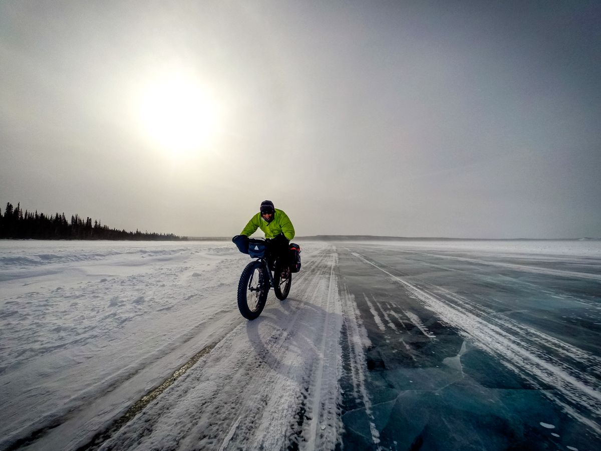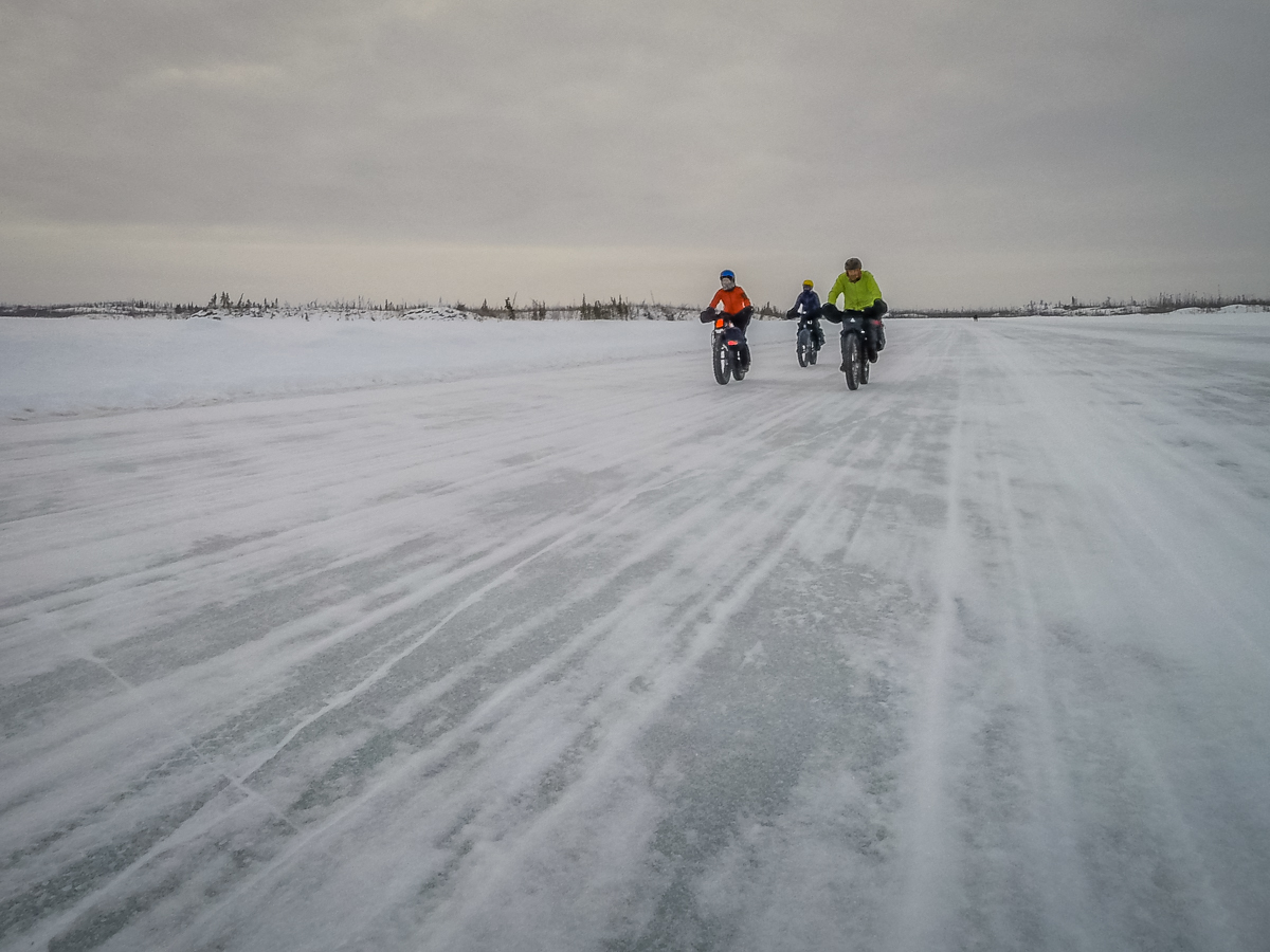 The ice on the lake is the most beautiful ice – crystal clear and smoother than most hockey arenas. We are on bikes, on a 25km long lake and heading straight into a 30 to 40km headwind. At times it seems that pushing the bike is less work than trying to peddle.