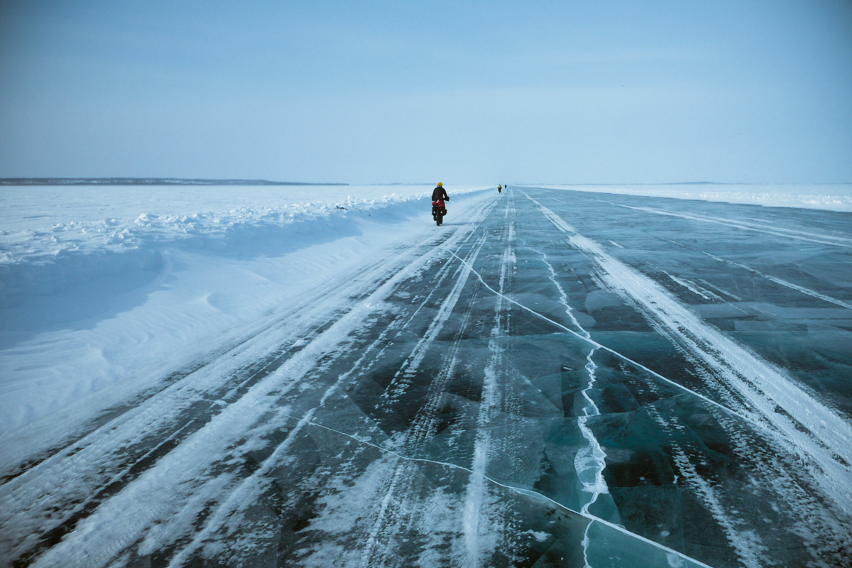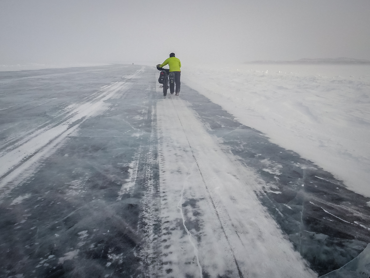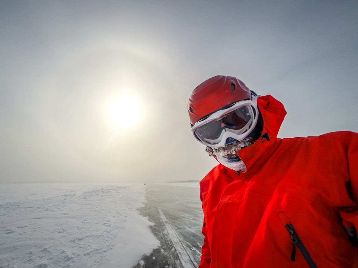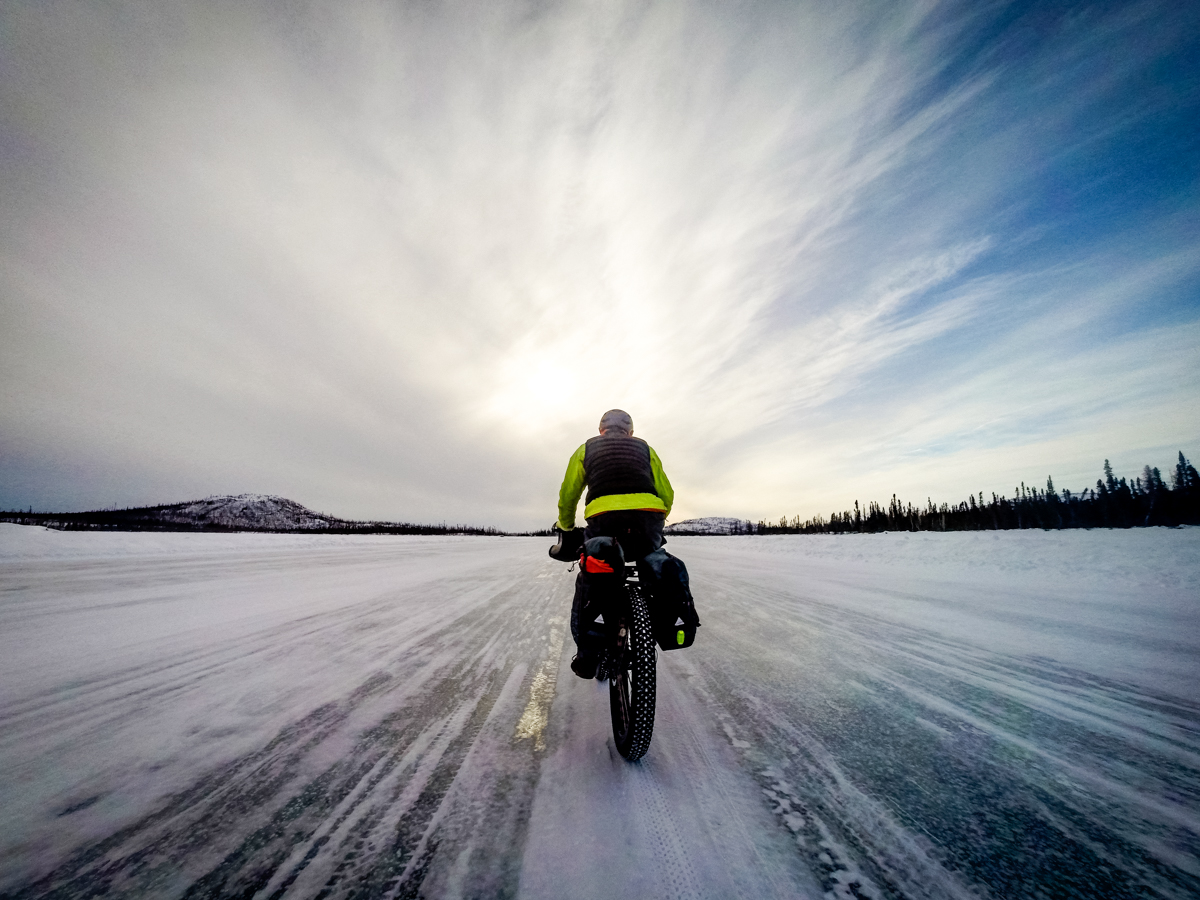 The ice on the lake is the most beautiful ice – crystal clear and smoother than most hockey arenas. We are on bikes, on a 25km long lake and heading straight into a 30 to 40km headwind. At times it seems that pushing the bike is less work than trying to peddle.