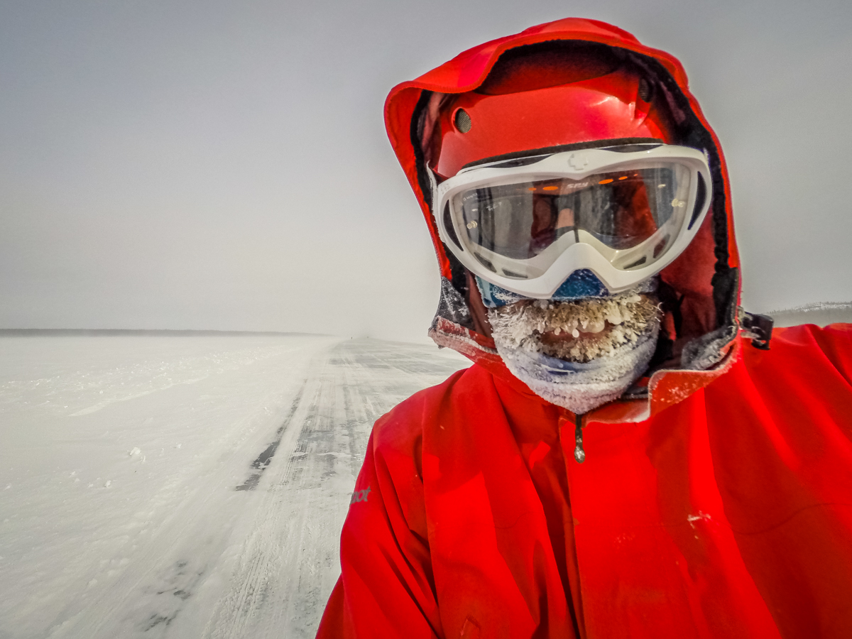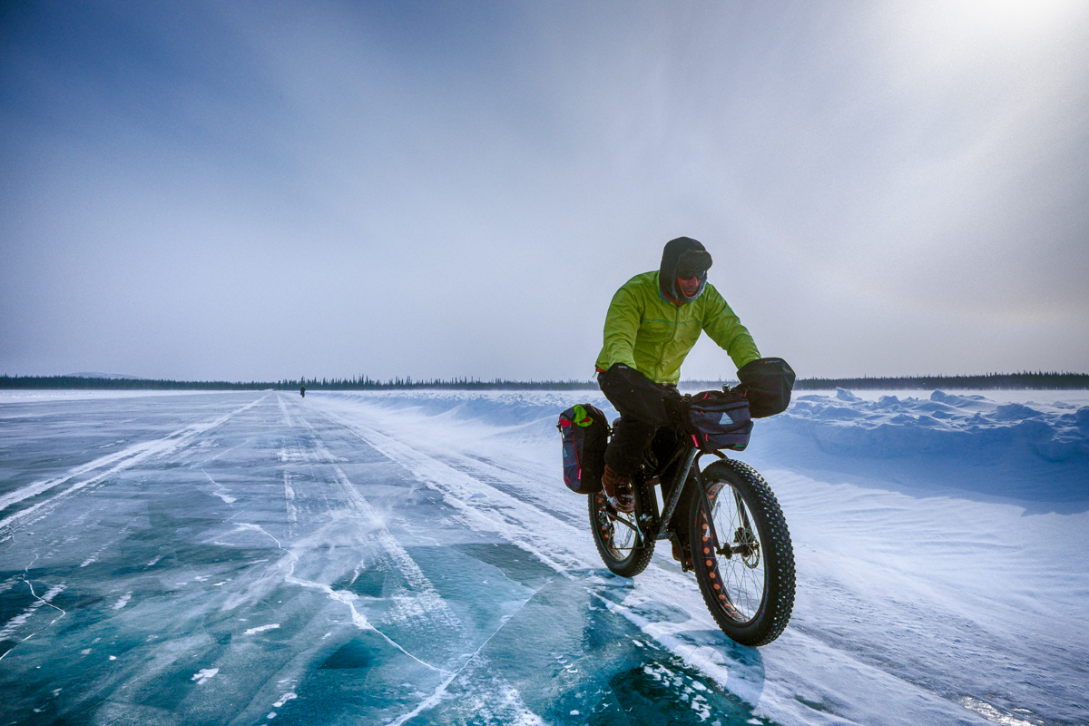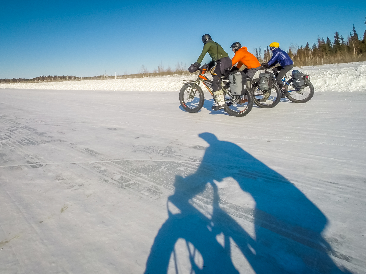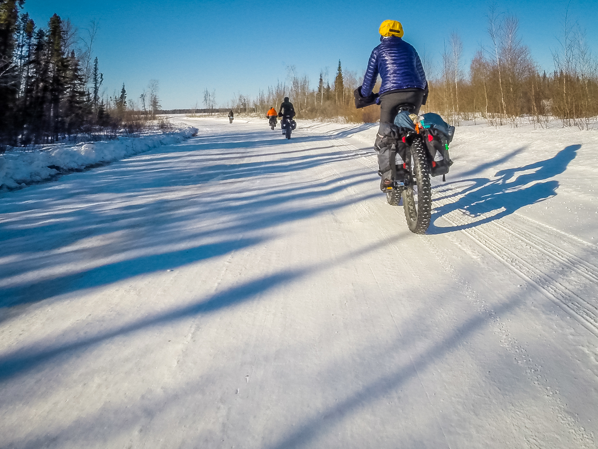 Day two started with pushing our bikes a few kilometers to get out bodies and muscles warmed up for a day of biking. As we rode, lakes and portages passed by. Each of the bikers traveling at their own speed; ride fast enough to keep warm and slow enough to not break a sweat (sweating can cause hypothermia). Surprisingly, even in -70C rated boots feet still got cold.