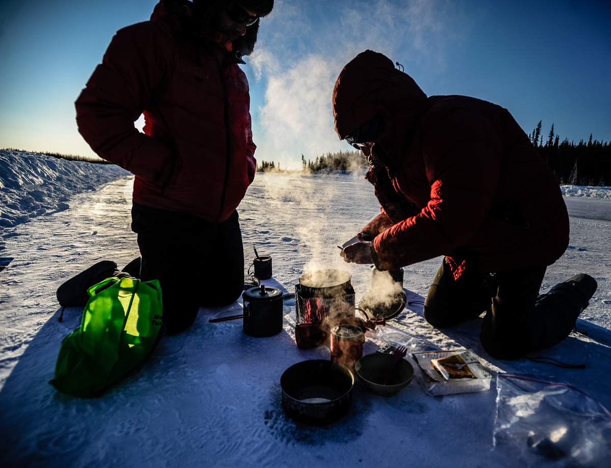 Earlier, Amanda, driving the support vehicle had selected a perfect location to set up camp on Mazenod Lake, and had even donned snowshoes to pack a trail and compact the snow to make setting up the tents so much easier. That evening, as we huddled around our camp stoves, comparing the calorie values of our respective boil-in-the bag meals, and tasting Ewan’s homemade hot water disolvable ‘pucks’ – to me they tasted like hand soap.