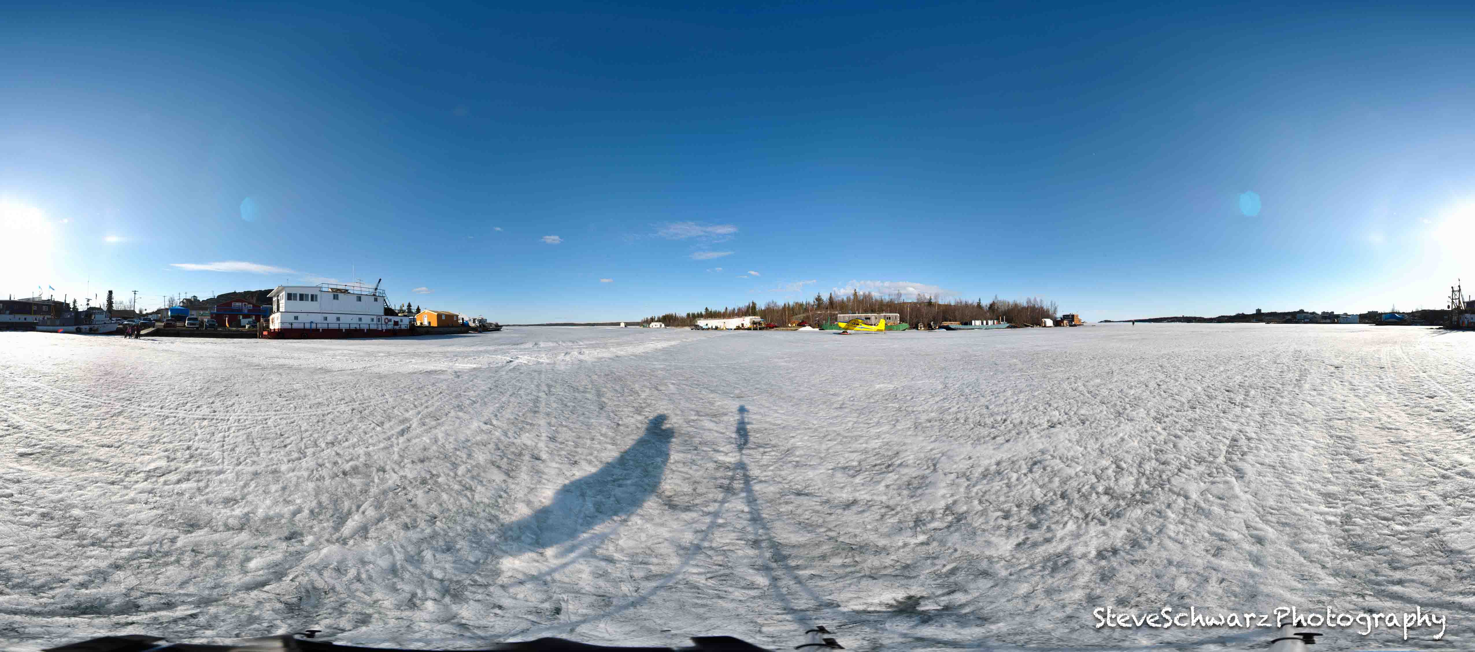 This panorama shows part of the Old Town of Yellowknife. I am standing in the middle of the channel, on approximately four feet of ice. On the left side of the photo below the large red and white houseboat is tied up to the Government dock. Pilots Monument is at the top of the hill behind the red building on the Government dock.
